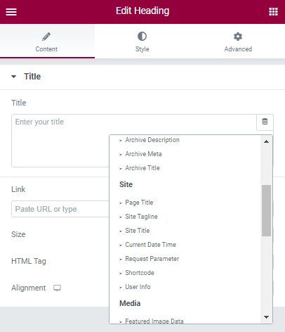 The dynamic content is available to almost any feature the Elementor supports. As an example, we will use the heading widget. You will see a small icon in the upper right corner of the title window. Click on it and you will see a multitude of options accessible to you. As far as we are concerned, we need to display the current year on our website. Locate the Site section underneath the dynamic content tab and choose the “Current Date Time”.