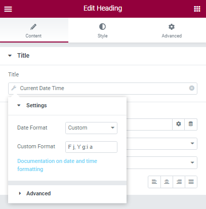 As you can see, the date, time, and current year have been displayed on our page. But we want to only show the current year, not the date and time. Click again on the title window and the settings menu will open. Evidently, two options are available to you- Date Format and Time Format. Now, click on the Date Format and choose the Custom option. You will be presented with a sequence of seemingly random letters (their meaning can be found in the Elementor documentation).