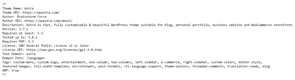 Next, you will need to create a stylesheet file named “style.css”. Consequently, this file will contain all of the CSS rules and declarations that regulate the appearance of your theme. At the very top of the file, you will need to insert a comment with the information about the theme you are using. As an example, we will use the Astra theme.